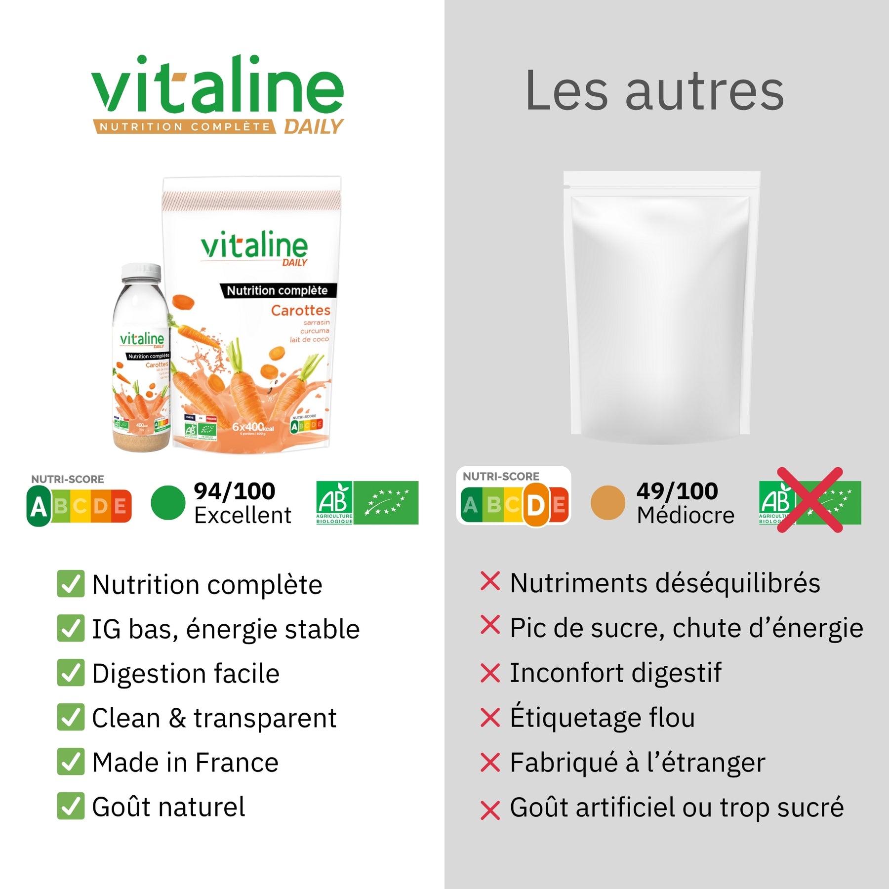 Vitaline Daily - Carrots, buckwheat, turmeric, coconut milk combines the nutritional performance of Vitaline with the natural, comforting taste of carrots, enhanced by a hint of turmeric.